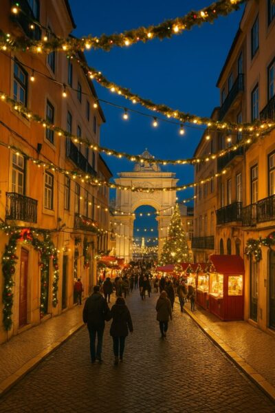 Lisbonne brille en décembre. Les ruelles de l’Alfama se parent de guirlandes, les marchés de Noël fleurissent sur la Praça do Comércio, et les quartiers historiques vibrent au son du fado. L’ambiance y est chaleureuse, entre traditions locales et touches internationales.