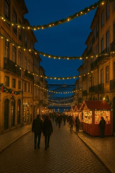 Porto conserve son âme pendant les fêtes. L’atmosphère y est plus traditionnelle, les prix sont souvent plus accessibles qu’à Lisbonne, et les opportunités immobilières sont nombreuses dans des quartiers en plein renouveau (Bonfim, Campanhã…).