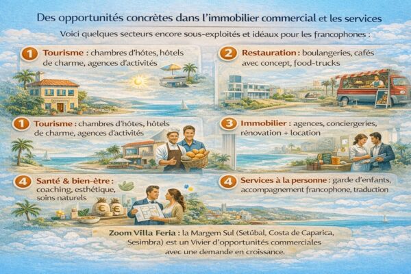 - Conclusion : un avenir plus libre commence iciCréer ou relancer un business au Portugal n’est pas un rêve inaccessible. C’est une réalité pour des centaines de francophones chaque année. Avec les bons partenaires et une vision claire, tout est possible.Vous voulez démarrer ? Parlez-nous de votre projet. Ensemble, nous ferons du Portugal votre nouvelle terre d’opportunités.Contactez-nous pour en discuter Prêt à surmonter vos peurs d’expatriation et à nous rencontrer au Portugal ?