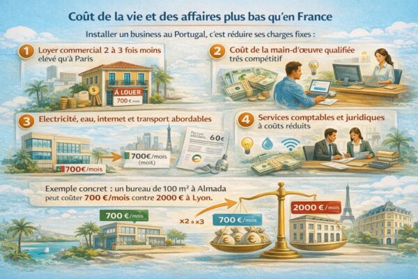 Exemple concret : un bureau de 100 m² à Almada peut coûter 700 €/mois contre 2000 € à Lyon.