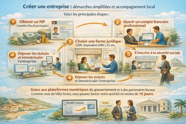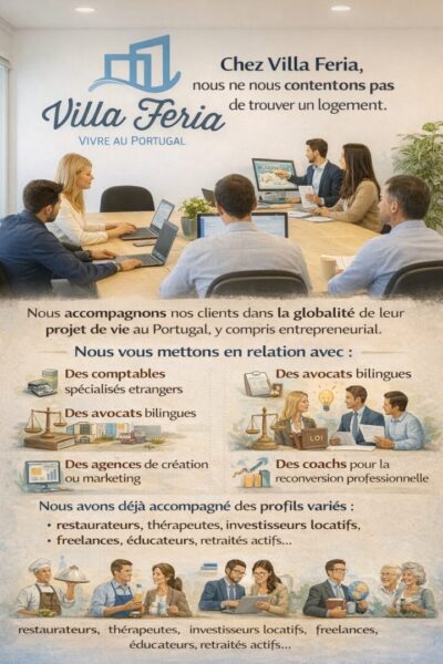 Chez Villa Feria, nous ne nous contentons pas de trouver un logement. Nous accompagnons nos clients dans la globalité de leur projet de vie au Portugal, y compris entrepreneurial.